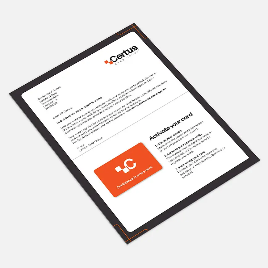 Many ID cards, particularly those issued as part of membership or access programmes, are delivered directly to individuals. Certus produces a wide range of carriers to support secure delivery and presentation, from personalised letters and envelopes to premium presentation wallets. Many organisations choose a mix of carrier formats depending on how cards are issued and distributed.